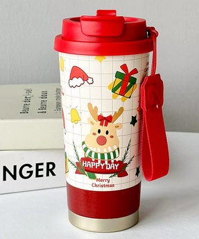Deer Happy Red Lid Christmas Themed Coffee-Water Tumbler Bottle 500Ml With Free Cleaning Brush